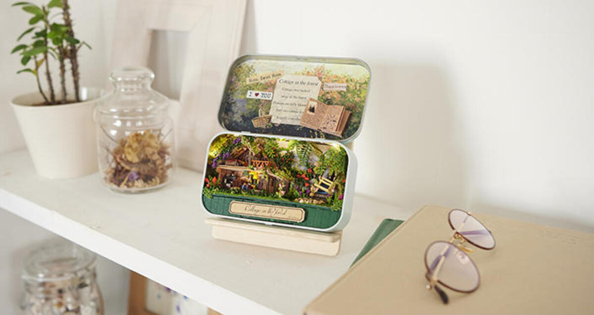 「ミニチュア工作」とは言っても、何をどうはじめたらよいの?というあなたにおすすめなのが、本格的だけど手軽にはじめられる「ミニチュアハンドメイドキット」。〈やのまん ミニチュアット〉シリーズは、小さな缶の中に、「夕暮れのカフェ」や「森のコテージ」などをテーマにした世界をつくることができます。