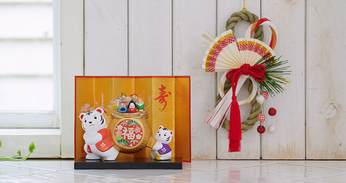 お正月飾りの定番といえばしめ縄。最近ではお部屋の中でも飾れるかわいらしいサイズ感のものがたくさんあるんですよ。〈越後稲わら飾り 祝い赤房〉は、京都友禅和紙、水引を贅沢にあしらった一品。玄関ドアに飾ることはもちろん、お部屋の壁にかけて飾るのもおすすめです。そんなしめ縄と一緒に、2022年の干支である寅の置物や和のフラワーアレンジを飾ってみるのも◎。お部屋が華やかになり、おめでたいムードを演出してくれそうです。
