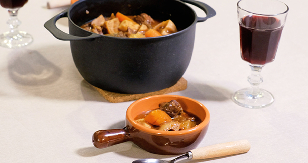③ ②に玉ねぎ、人参、レンコン、大根、ごぼうを加え軽く炒め、漬け込んでいた赤ワイン、水をひたひたになるまで加えて強火で沸騰させる。あくを取り、弱火にして蓋をしたら1時間弱煮込む。
