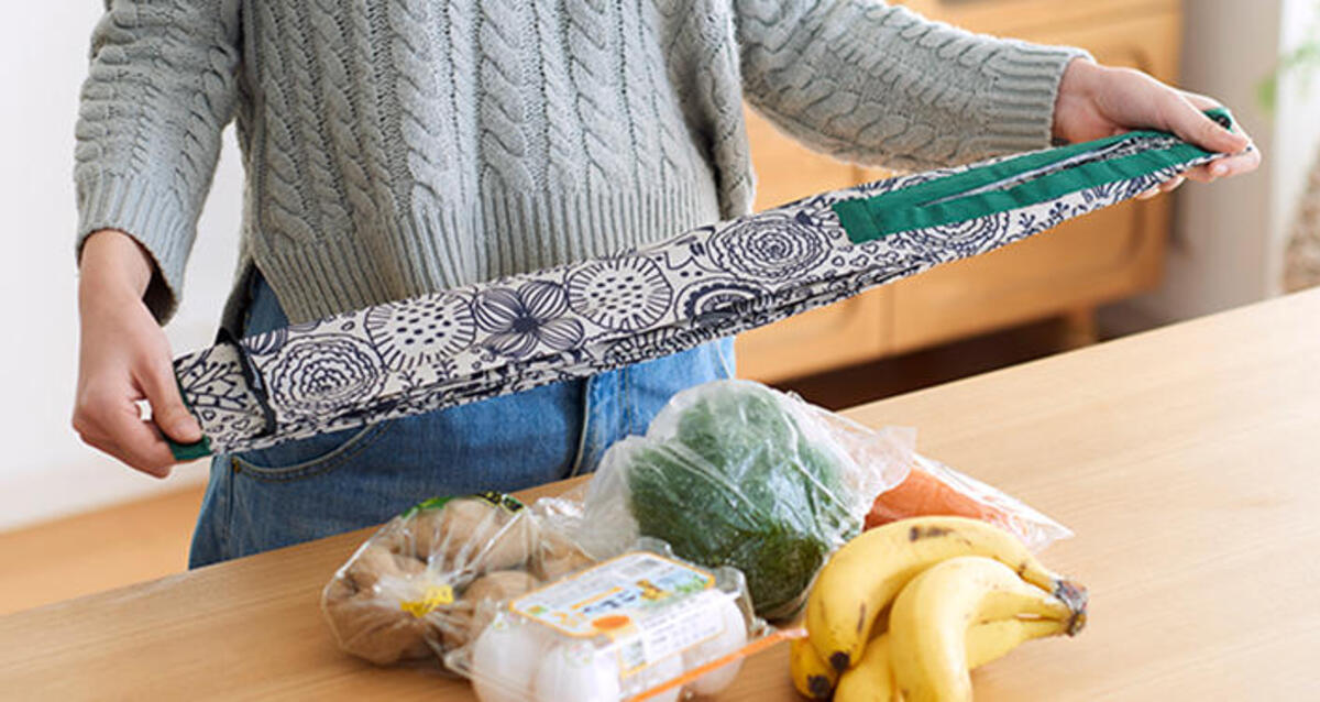 「エコバッグってたたむのが面倒」という声から生まれた、一気にたためるバッグ。両端を引っ張ると一気に帯状になり、一瞬で折りたためます。あとはクルクルっと丸めるだけ。形もサイズも色もバリエーション豊富で、さまざまな用途に合わせて選べます。
