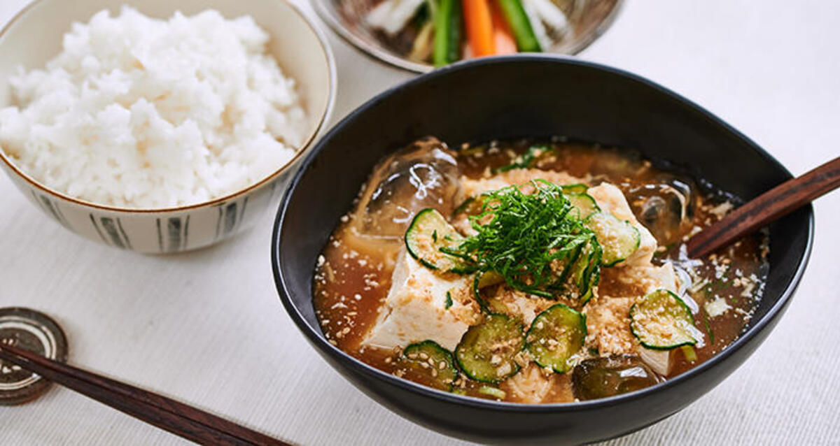 適度な塩分をおいしく摂れる「冷や汁」。出汁と味噌で味付けした味噌汁に、きゅうりや長ネギ、大葉などのさっぱり野菜と豆腐、粗く擦ったゴマなどをたっぷり入れて、冷やして食べます。塩分だけではなく野菜の栄養もしっかり摂れますよ。