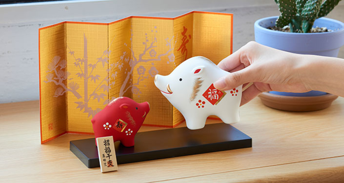 かわいらしくデフォルメされた紅白のイノシシの置物。イノシシは多産であることから、子孫繁栄のシンボルとしてまつられてきたという由来があります。家族のみんなが健やかで実り豊かな一年になるように。紅白のイノシシに願いを込めましょう!