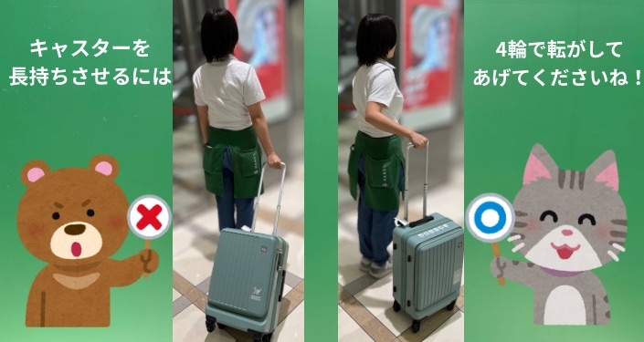 長くスーツケースを使っていただきたいので、ワンポイントアドバイス('ω')ノ4輪のスーツケースは4輪で転がすようにしてください!