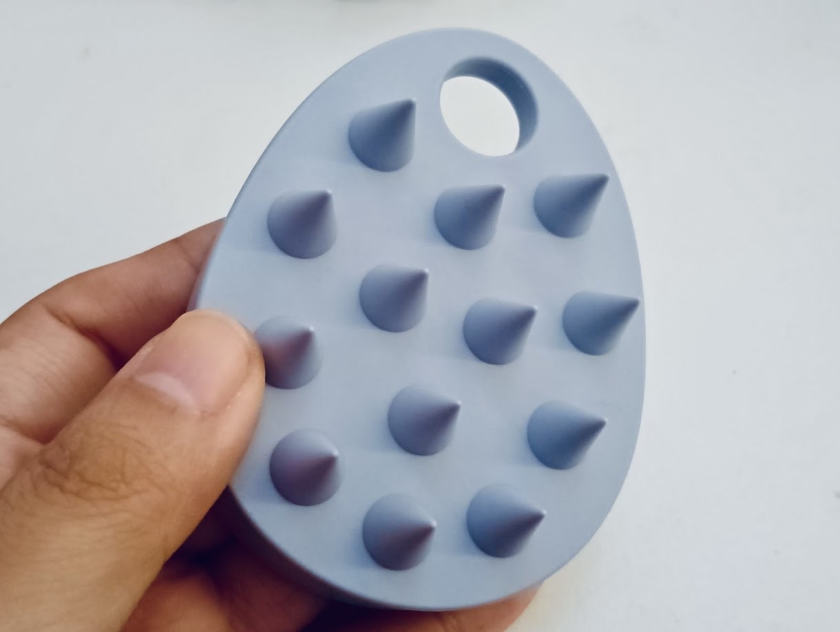 「シャンプーブラシ&頭皮のもみほぐしブラシ」の1つで二役できるシリコーン素材のブラシです。