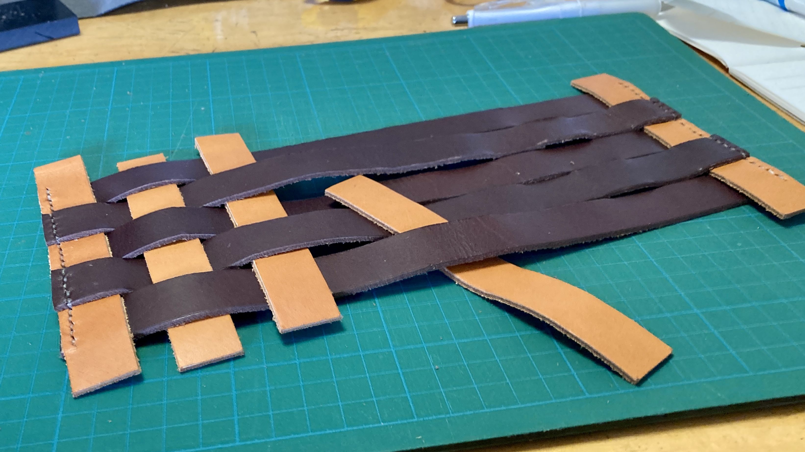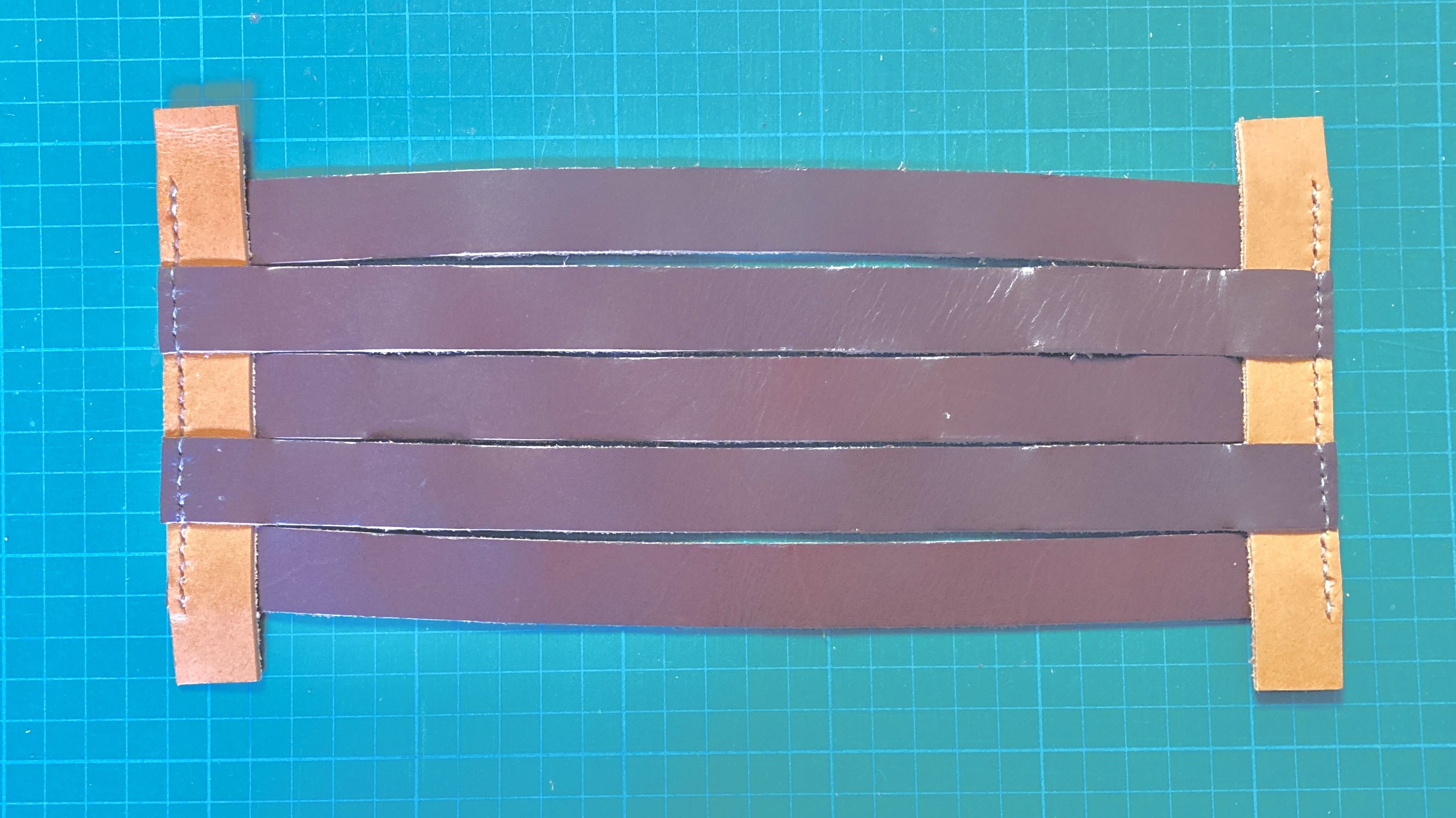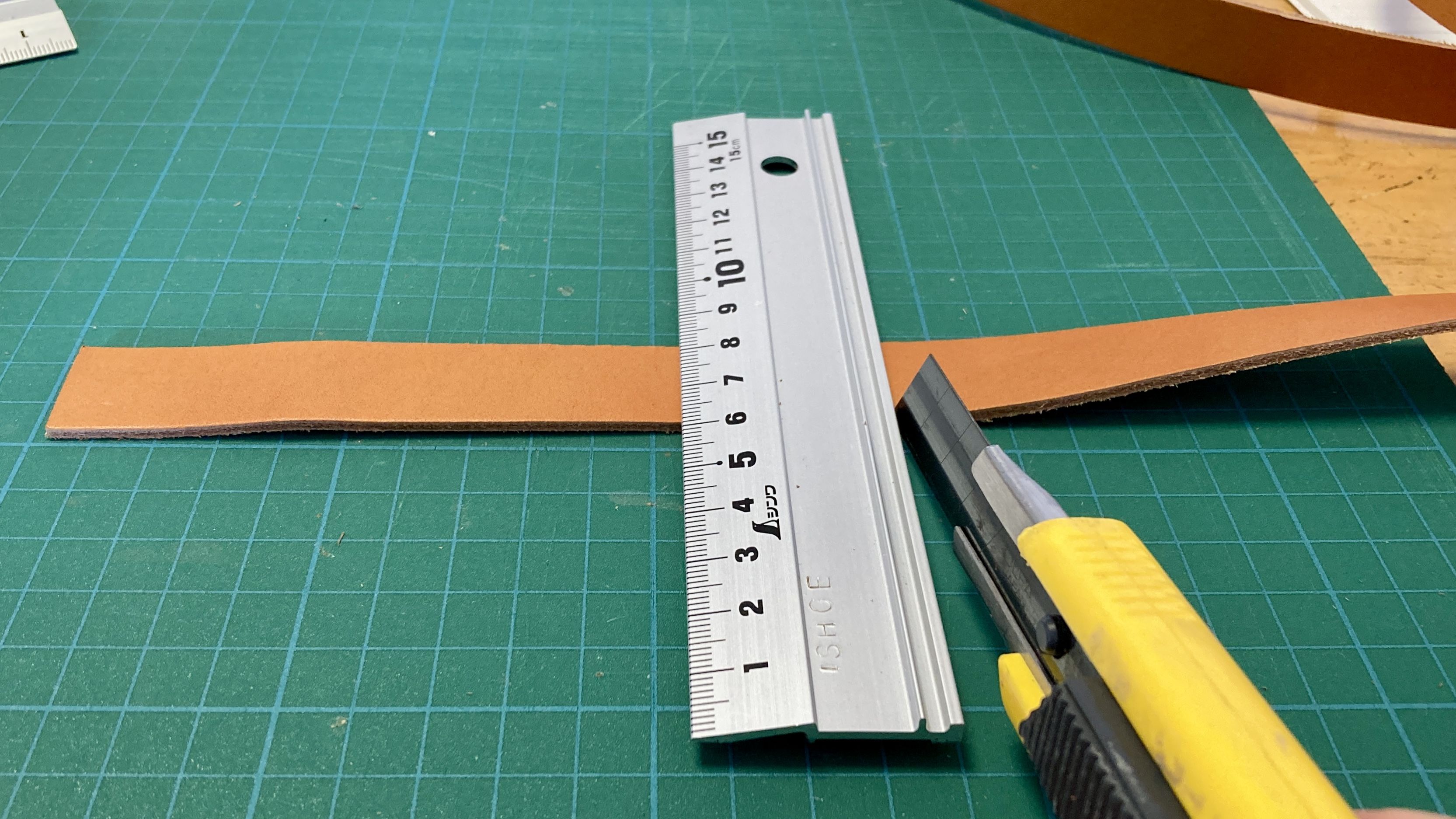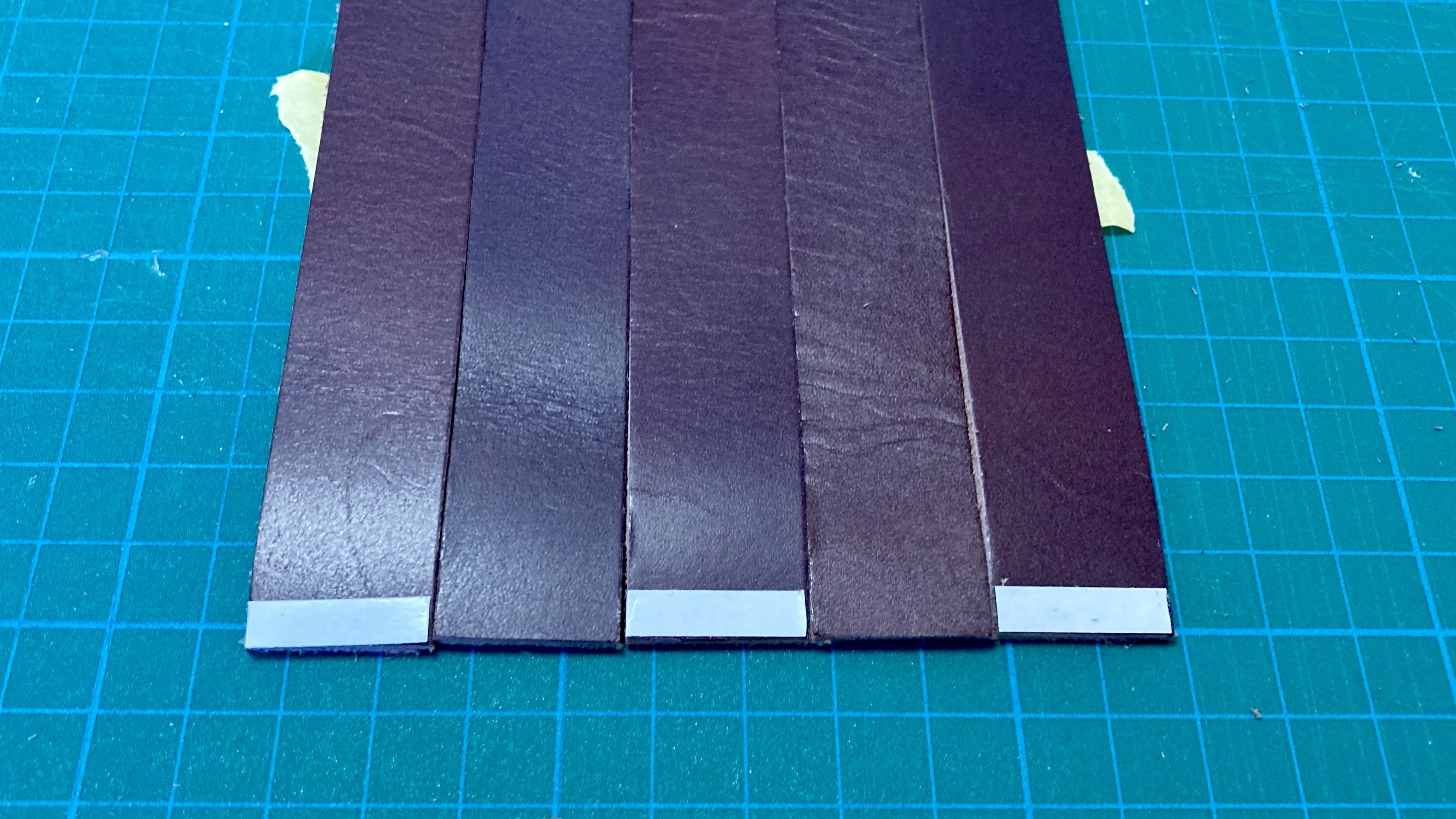 これも革の端材を帯状にカットしてつくりました。やわらかい革だったのでフニャフニャです。今回はこれを基につくりました。