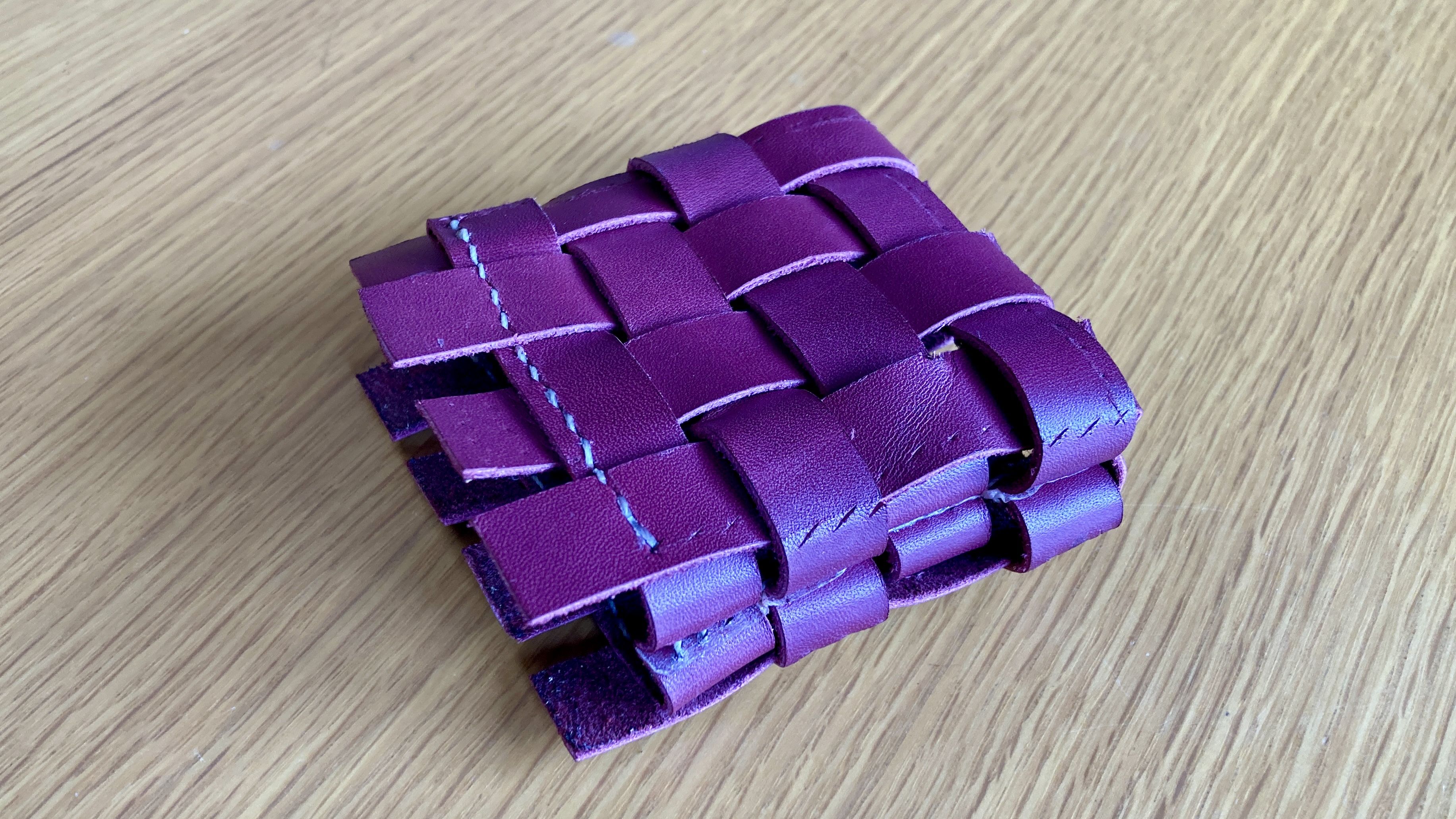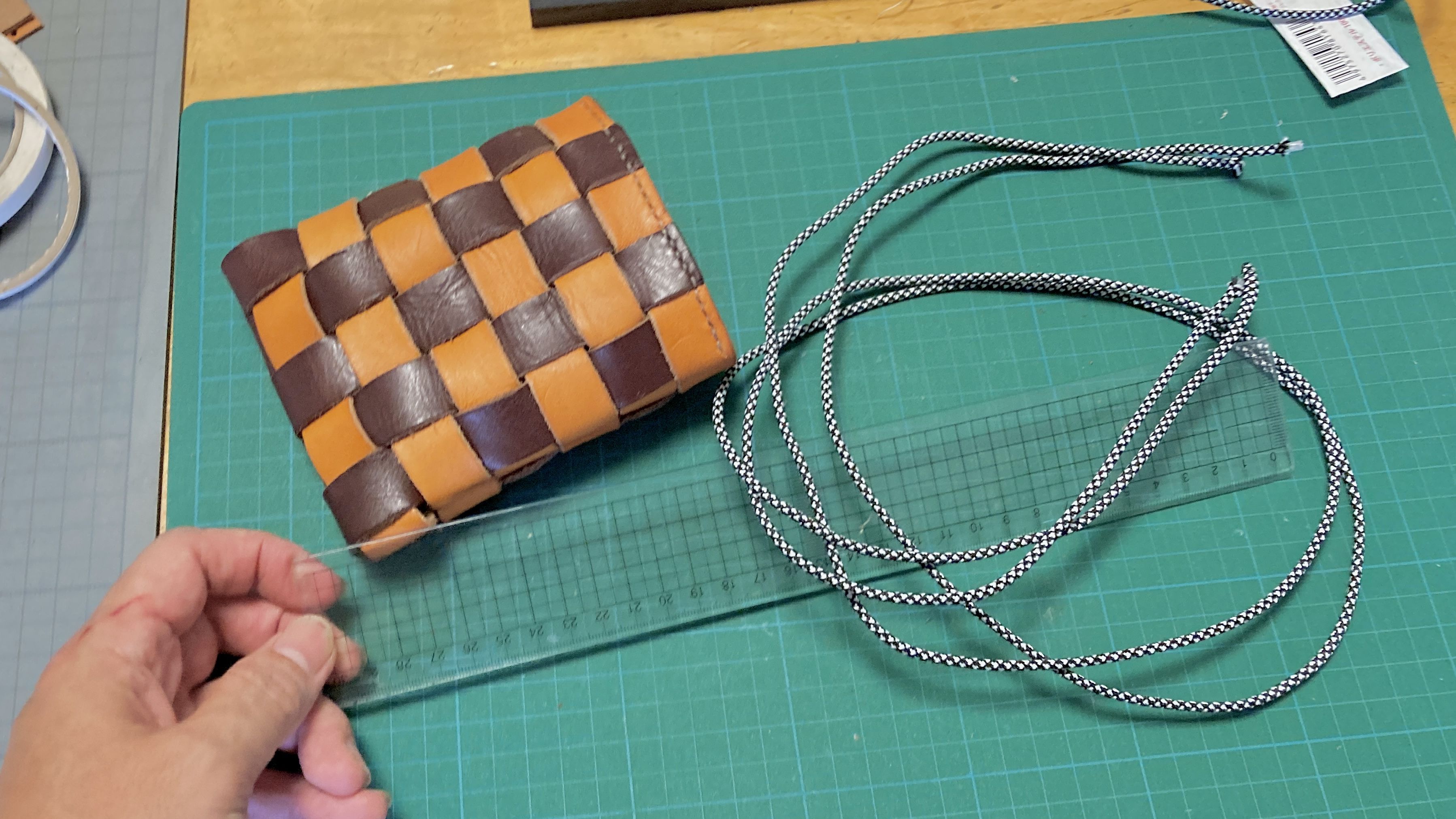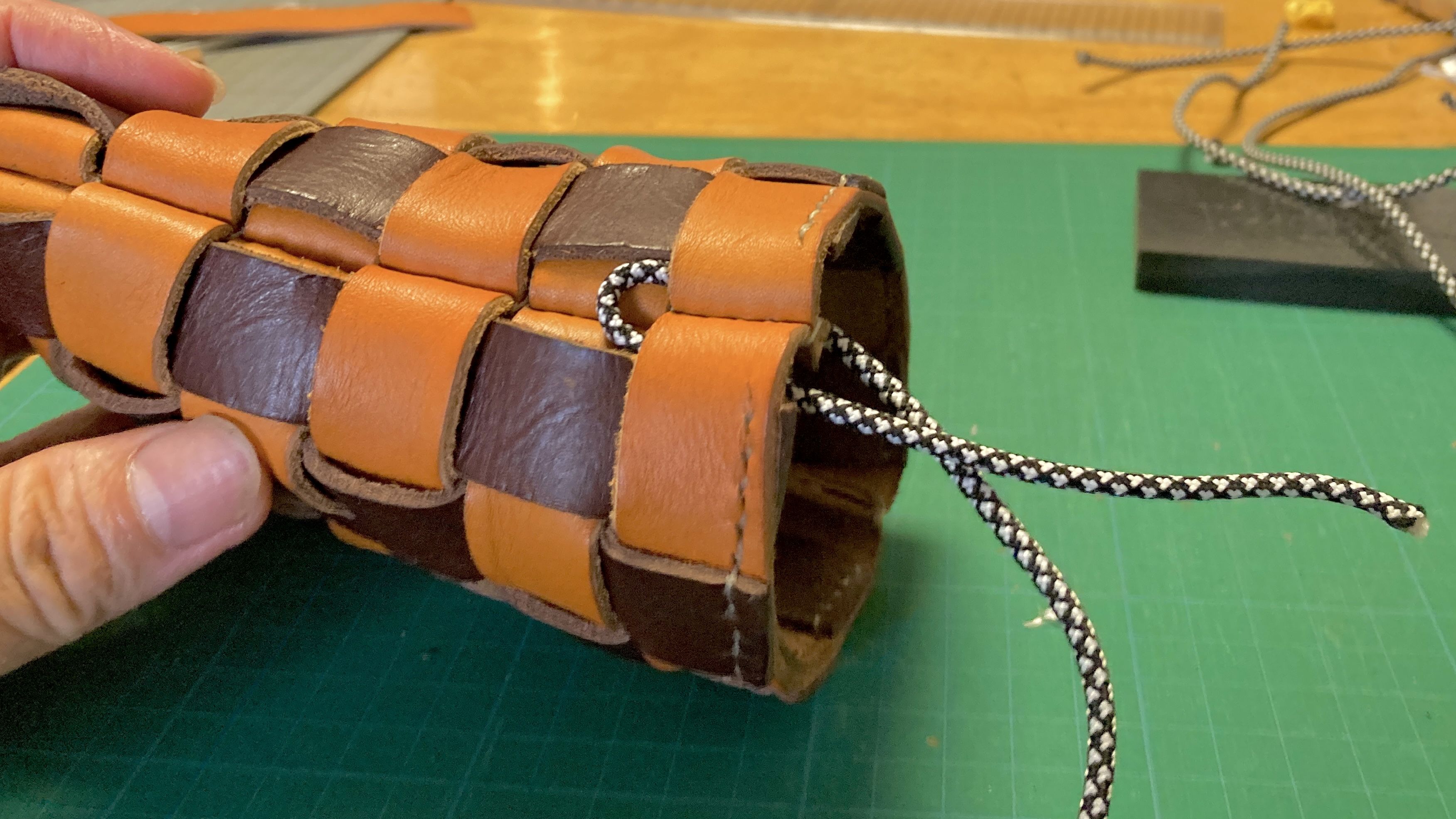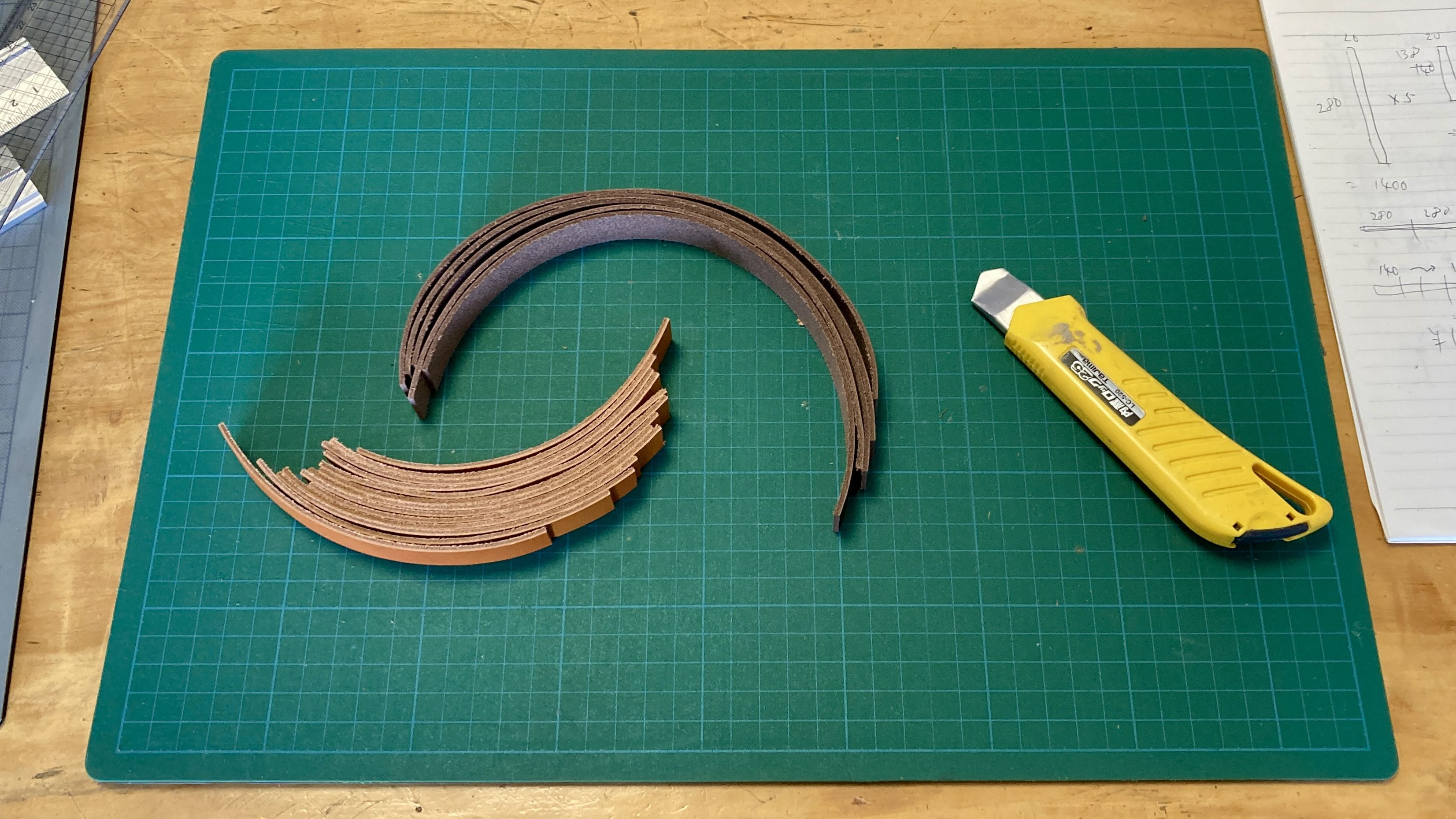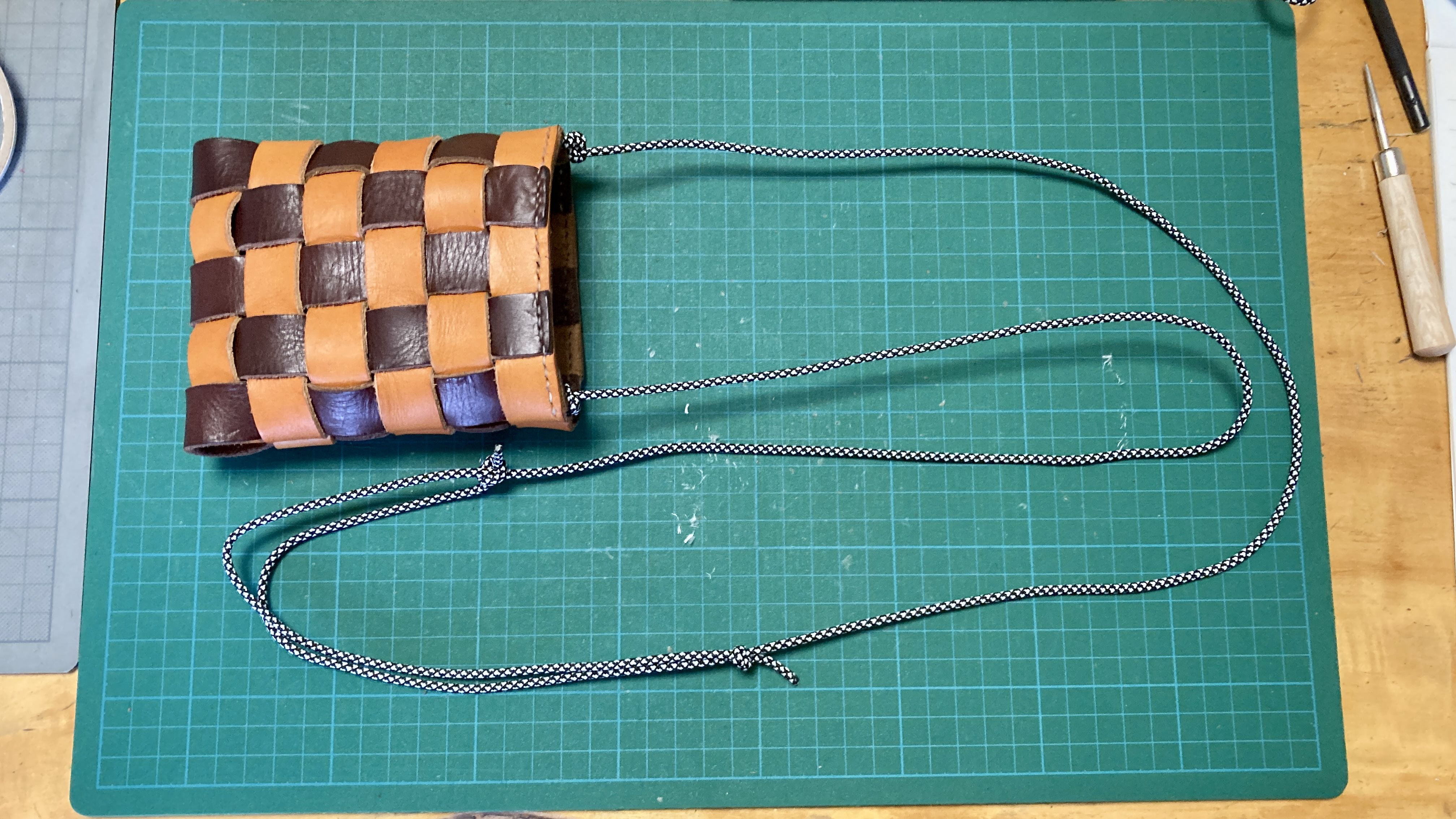 これも革の端材を帯状にカットしてつくりました。やわらかい革だったのでフニャフニャです。今回はこれを基につくりました。