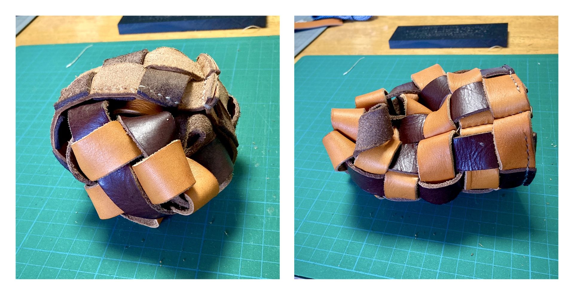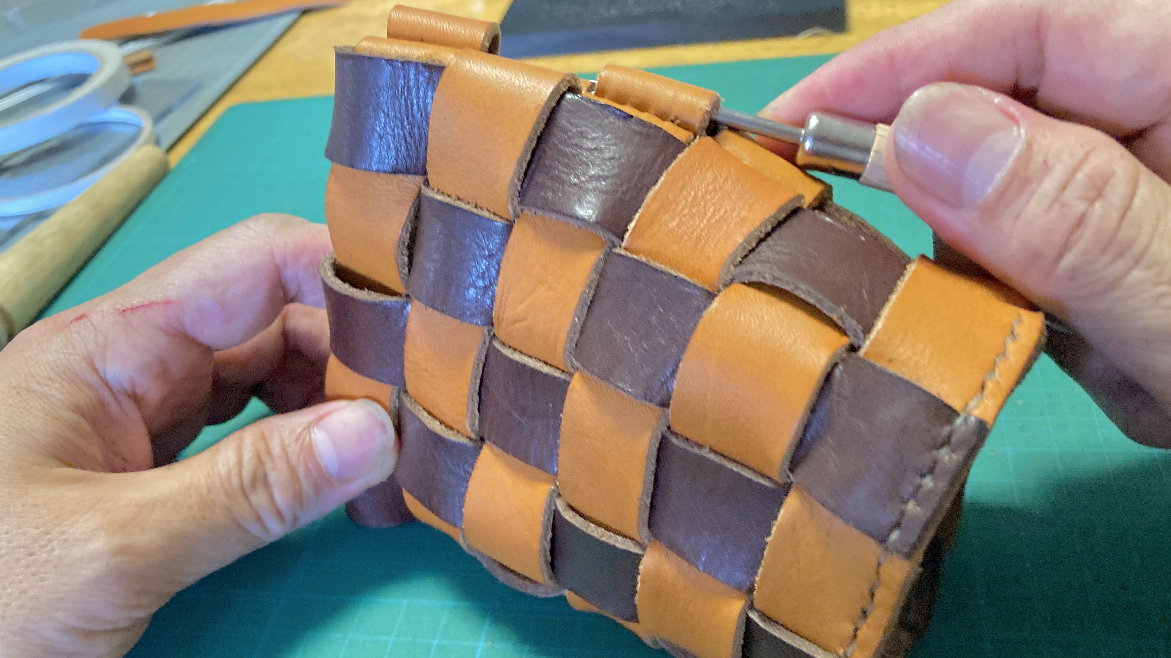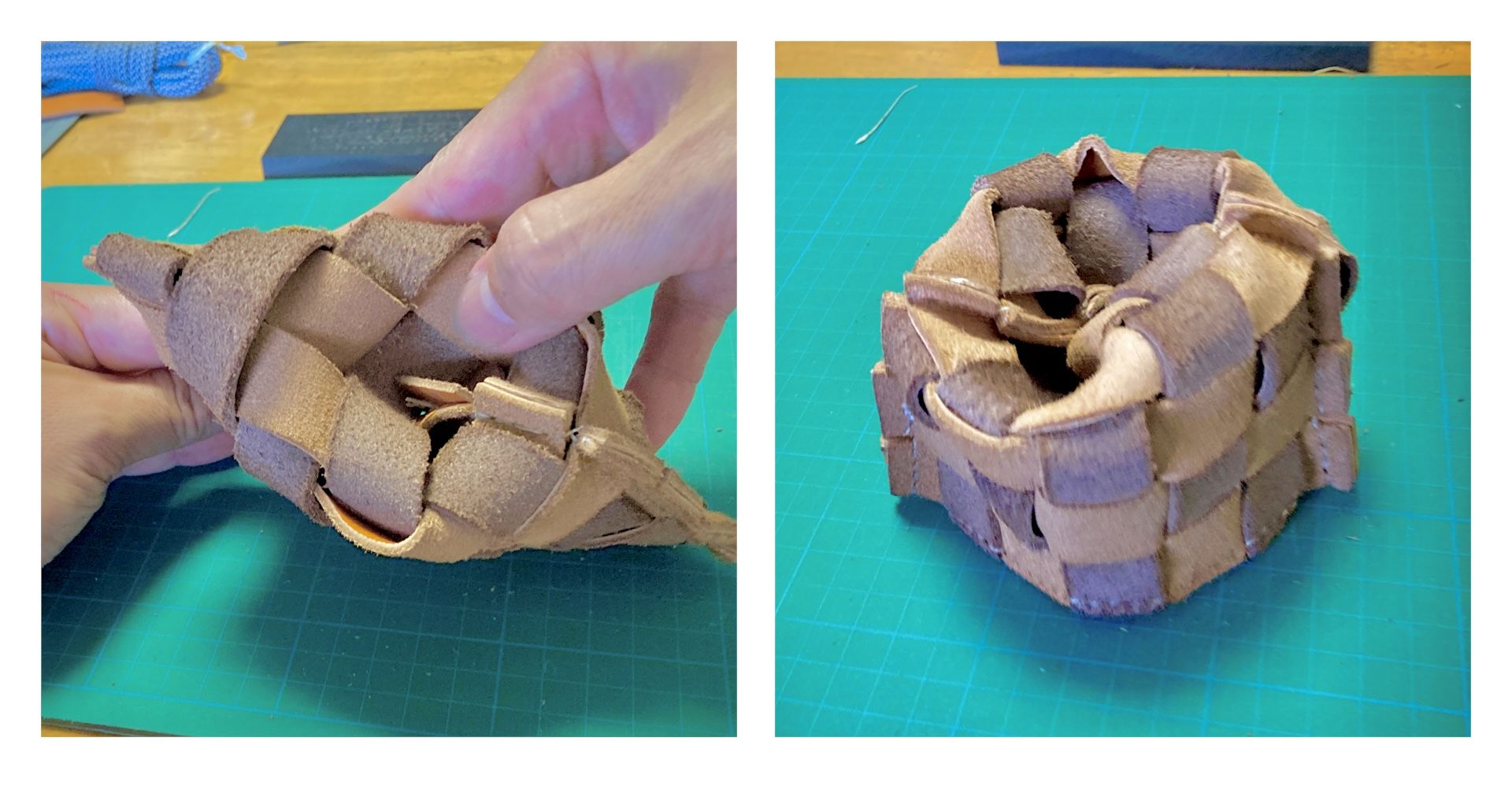 今回使用した「オイル革」は試作品よりずいぶん硬く、何度かあきらめかけたこともあったのですが、ずっと触っている内に少しやわらかくなってきました。