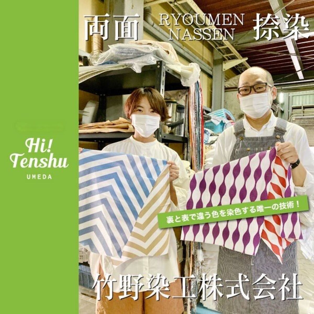 前回の東京オリンピックの3年前、昭和36年(1961年)に創業した竹野染工は、全国で唯一の技術「両面捺染(りょうめんなっせん)」という、裏表で違う色を染色する高い技術を活かした、和晒し織物業界全体の新しいブランディングを進めています。