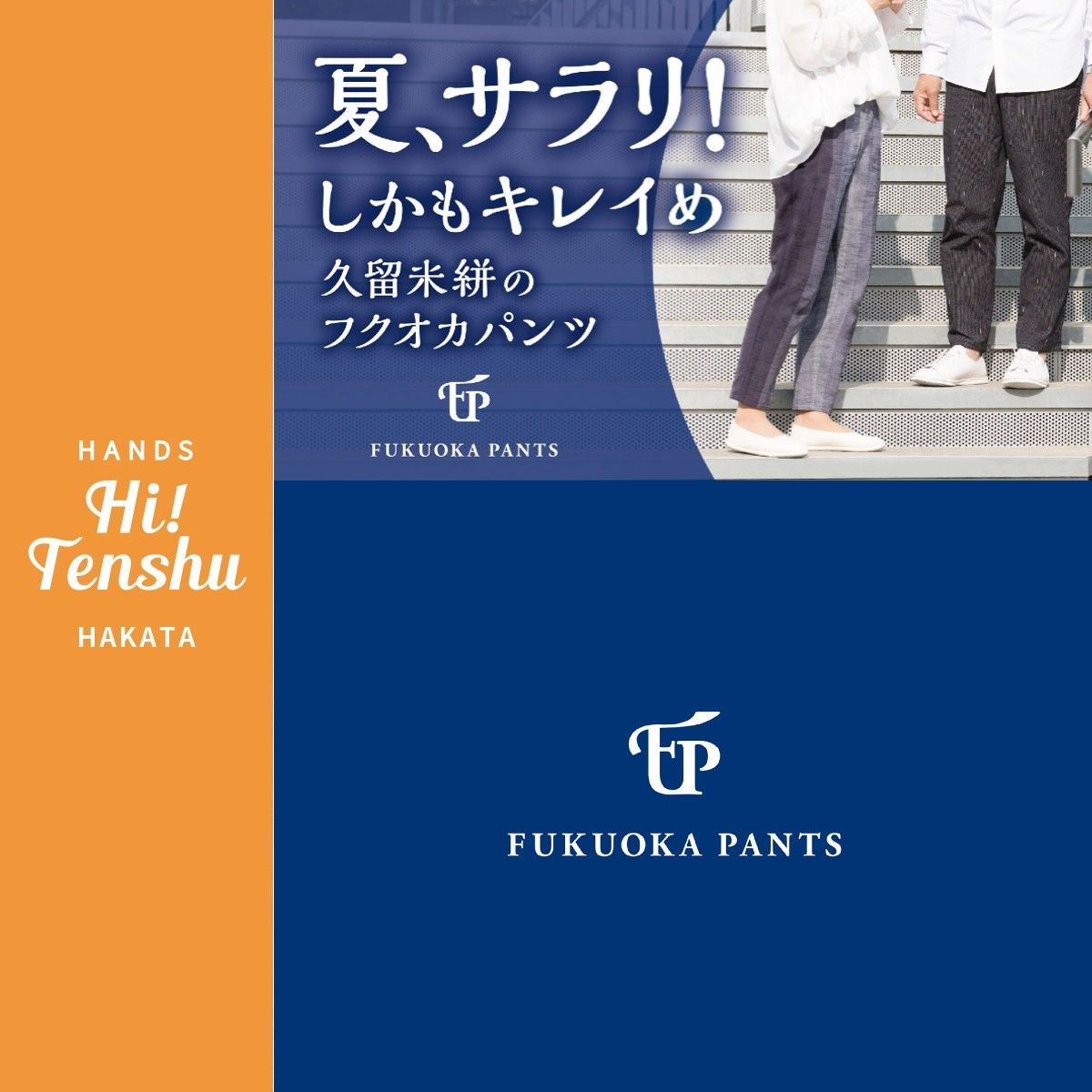 キレイめに着られる福岡産「フクオカパンツ」が誕生しました。少しでも地場産業の活性化に繋がればと、従来の久留米絣ファン"以外の方"にも知って欲しいと活動しています。