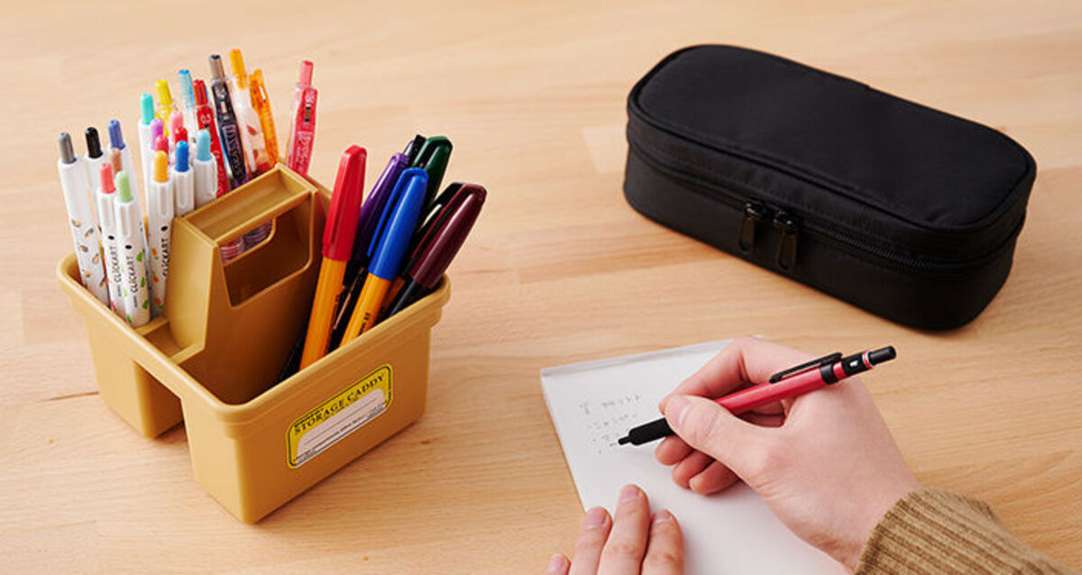 持ち運びにも便利で身の回りの小物の整理にぴったりな、工具用ボックスを思わせる〈ペンコ ストレージキャディ〉は、例えば色数が多いサインペンのペン立てとして使うのもおすすめ。お気に入りのペンを立ててデスクに置いておけば、ちょっぴりおしゃれに見えそうですね。キャップ式のように見えて、実はキャップ部分を押すノック式という〈アンテリック ゲルインクボールペン〉も、そのデザインや色づかいでデスクまわりを楽しく彩ってくれますよ。