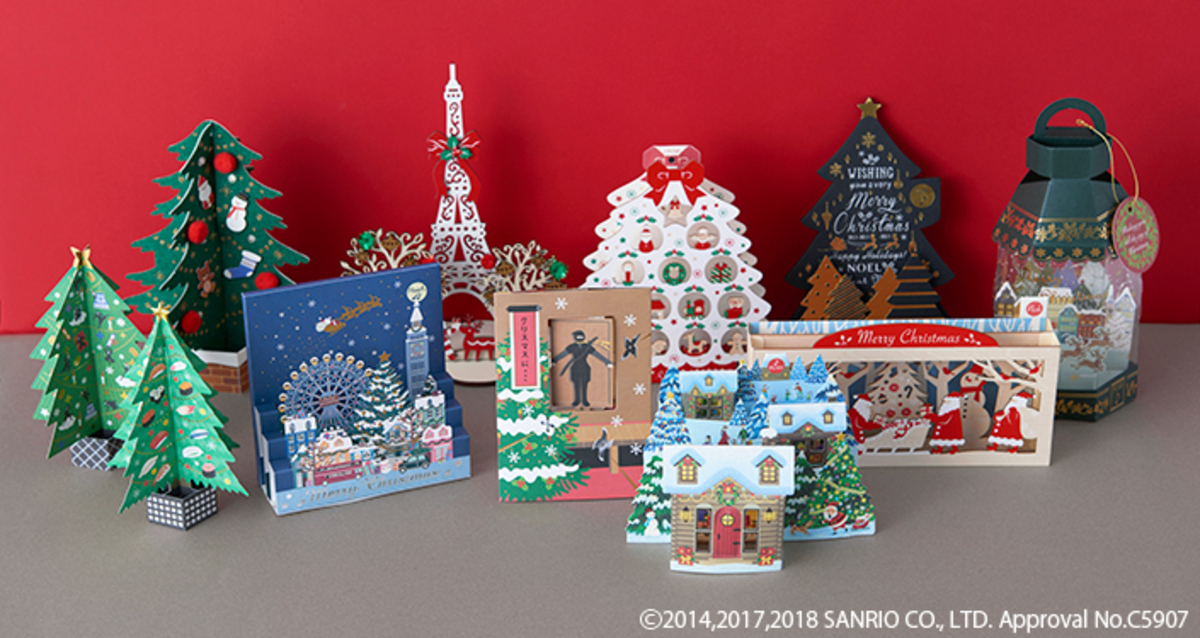 一番左は、星の代わりに手裏剣が描かれた忍者ツリー。小判や巻物、サンタの帽子を被った忍者など、おもしろいモチーフがたくさん!巻物デザインのミニカードに、メッセージを書くことができます。