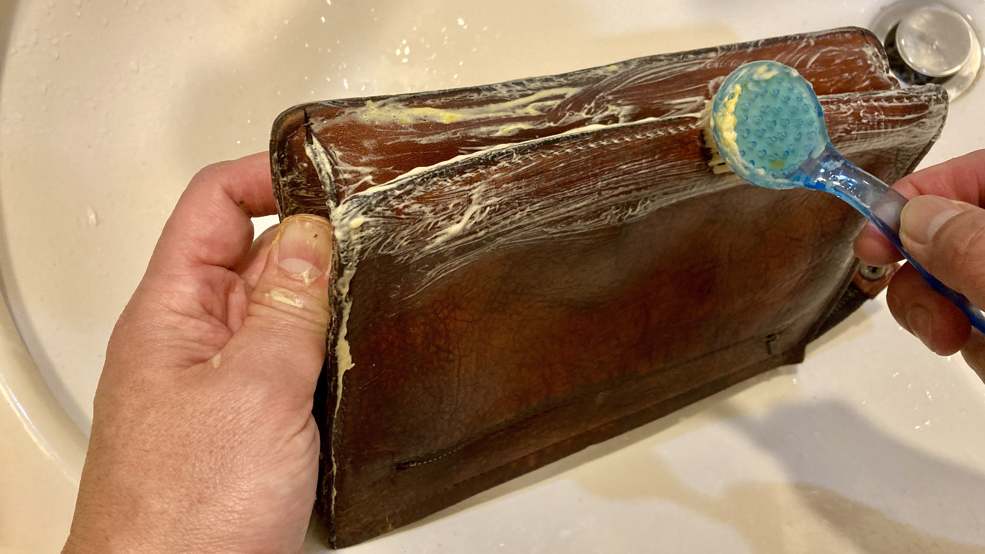 「古くてカピカピに乾燥してカビまで生えている革のポーチをクリーニングと保湿で再生してみた」