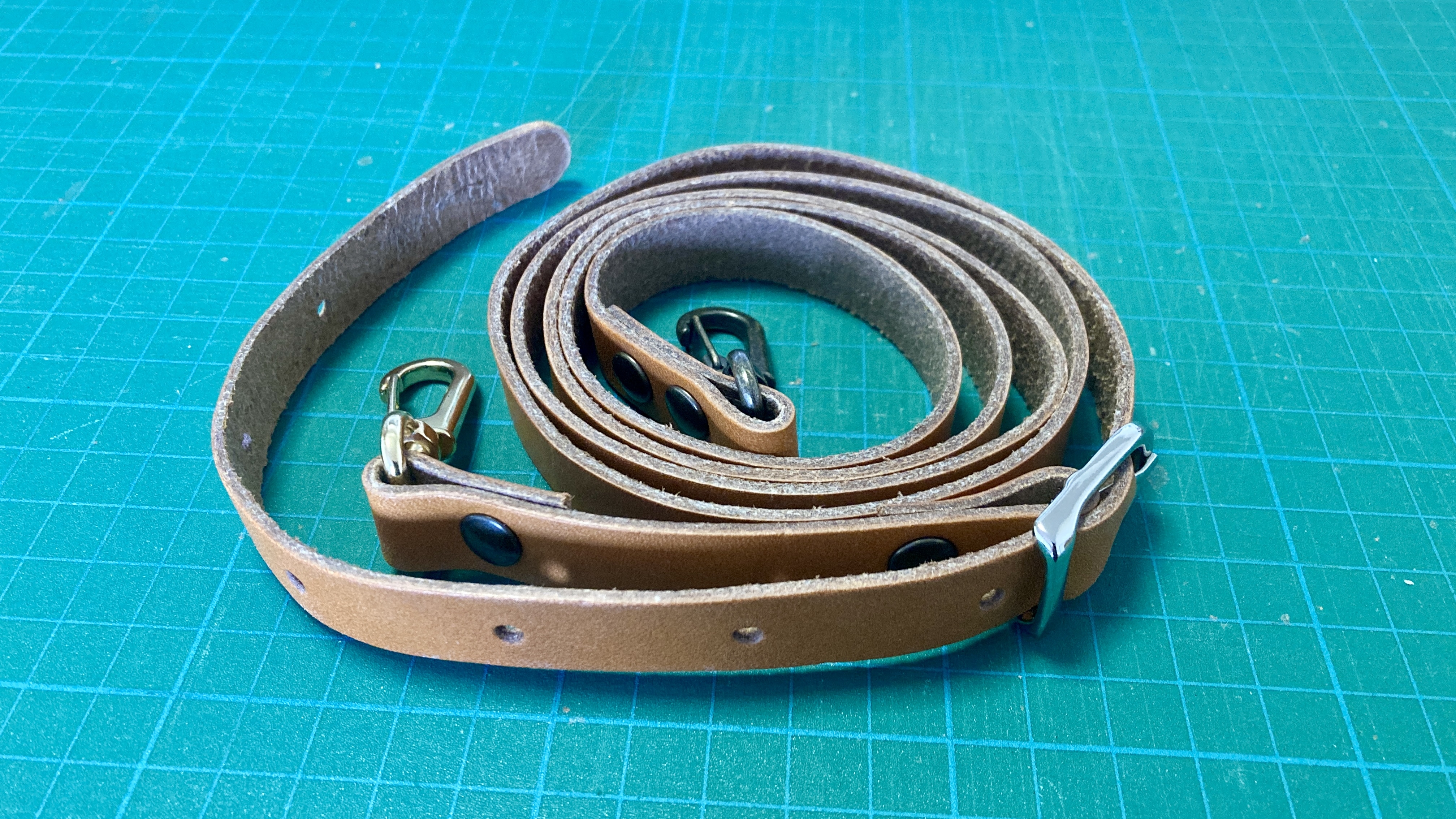 革のショルダーベルトは本来薄めの革を裏に貼って縫い付けるのがベストです。でもそうすると約3Mほど革を縫わないといけないのであんまりやりたくありません。