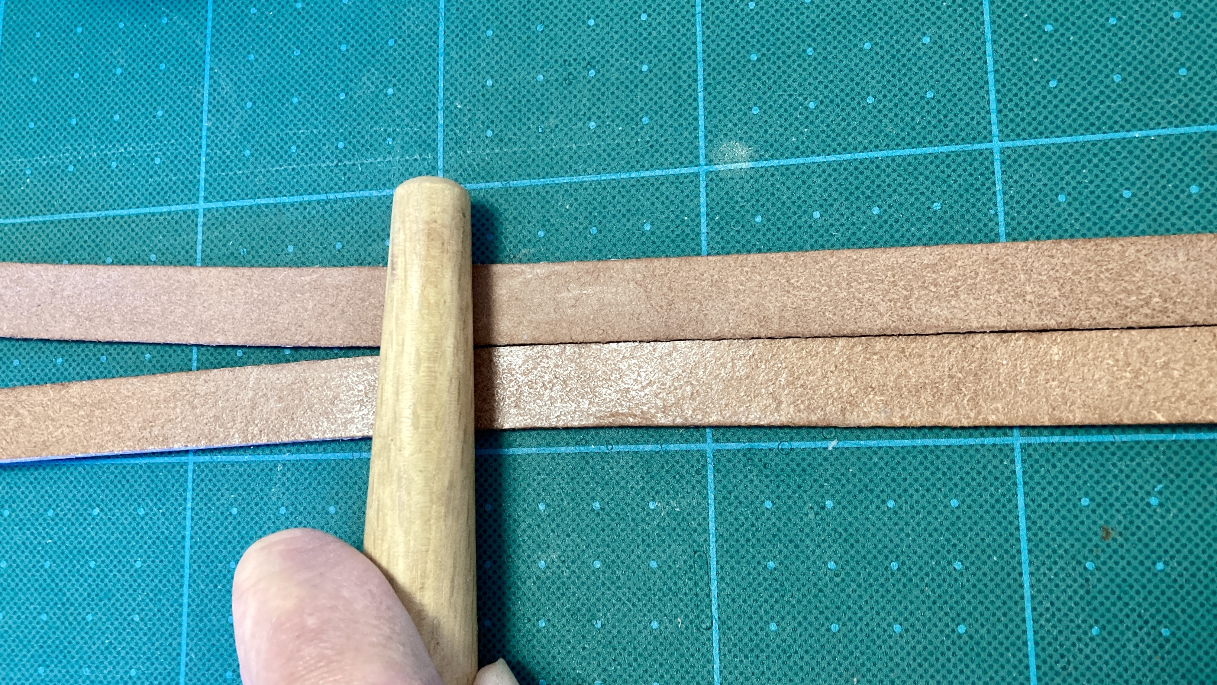 ショルダーベルトは2枚の革を縫い合わせて両面を表面にして使うことが多いのですが、今回は1枚でやります。