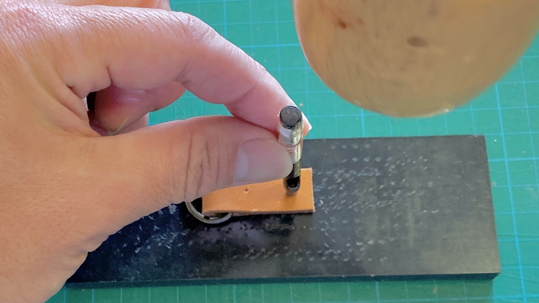 打台の凹みに金具を乗せて、上から打棒を木槌で叩きます。