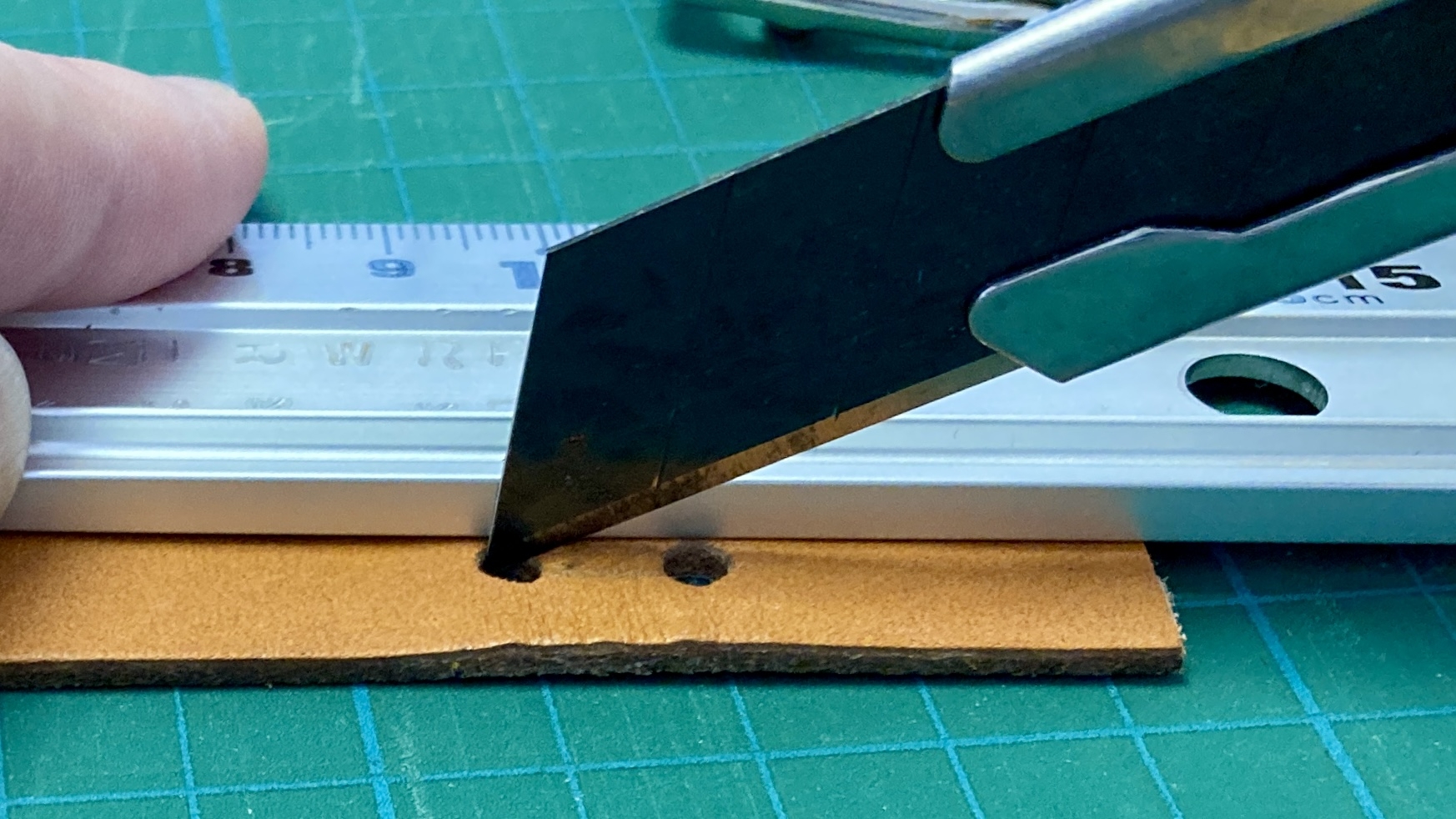 両端にハトメ抜きで穴を開けて穴を繋げます。ここも短い距離ですが定規を当ててカッターで切ります。