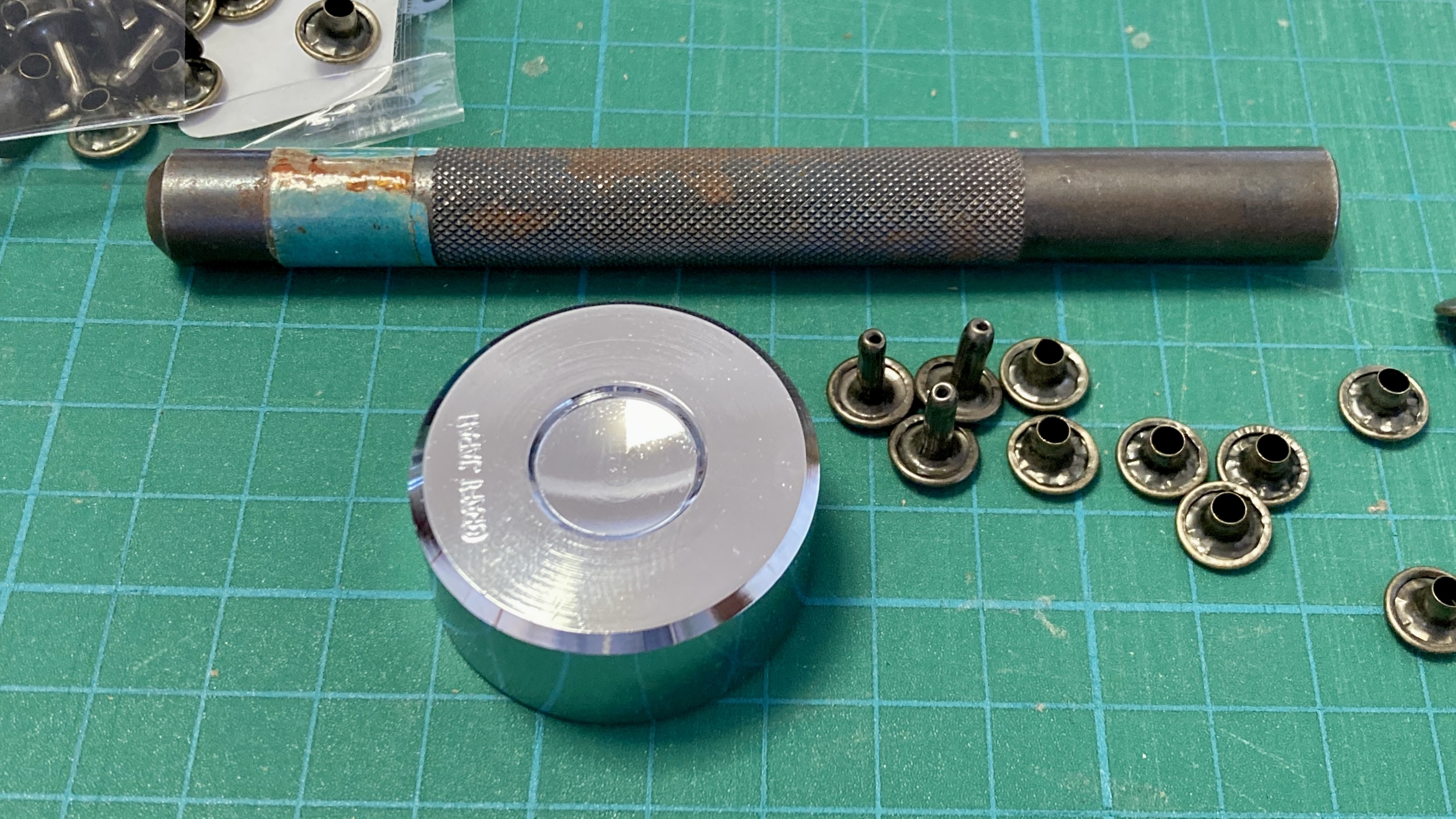 カシメ打ち棒と打ち台、カシメ金具を使います。![]()
