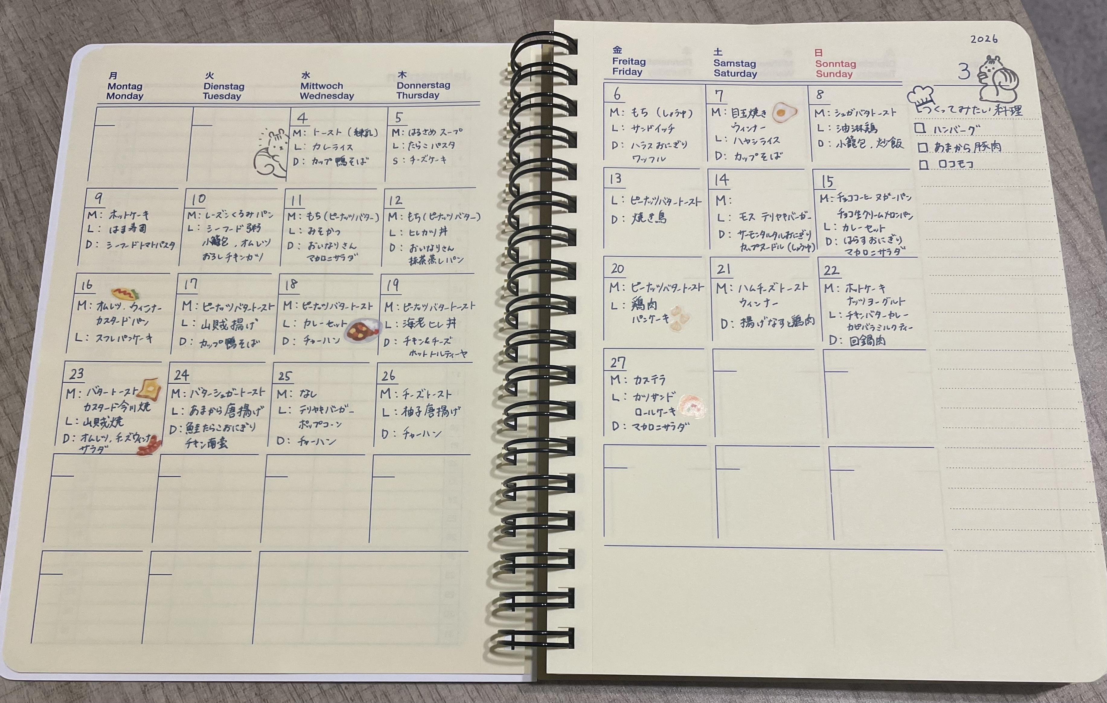 右のフリー欄には、今月つくりたい料理を箇条書きで書いてみました。
