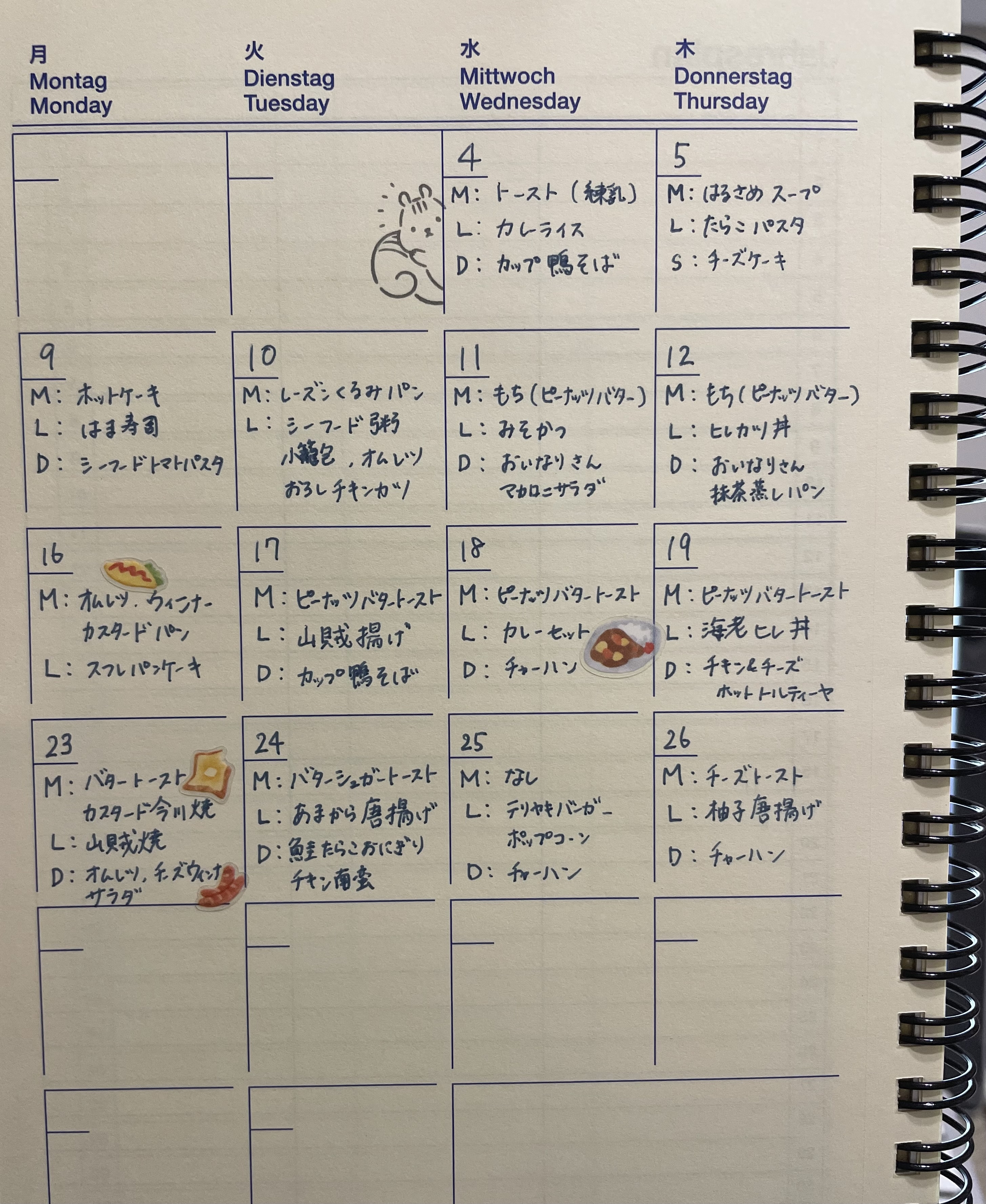 私は手帳ページに、食生活を見直すべく「毎日食べたもの」を記録しています。